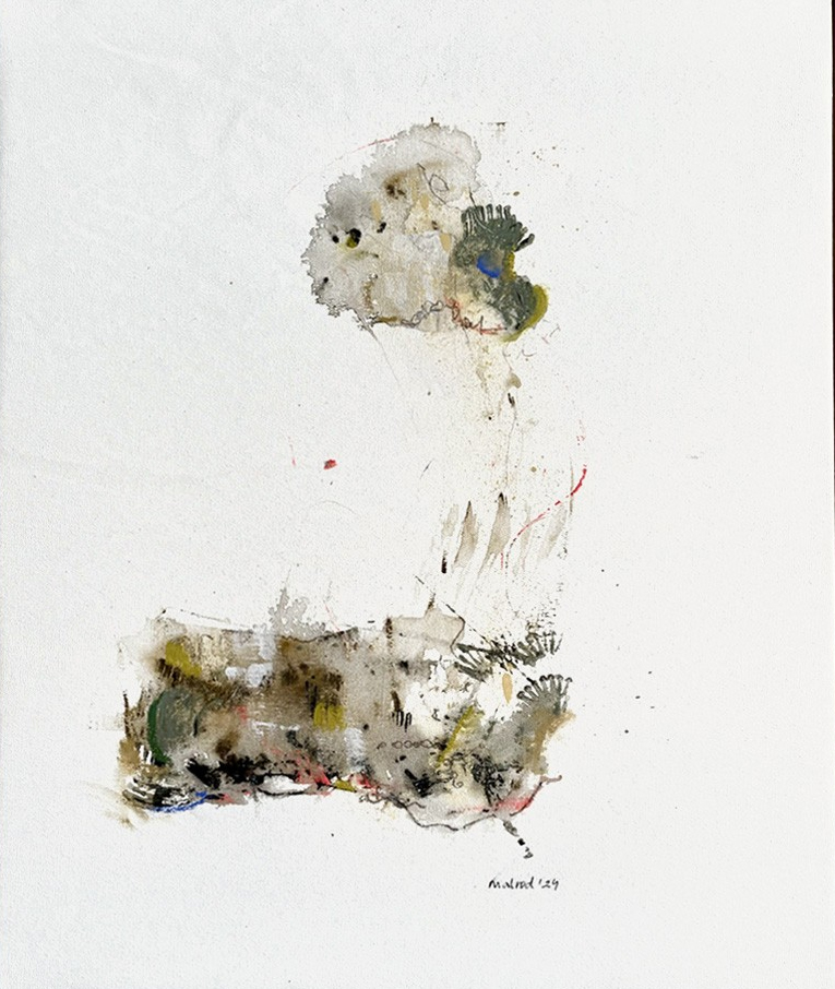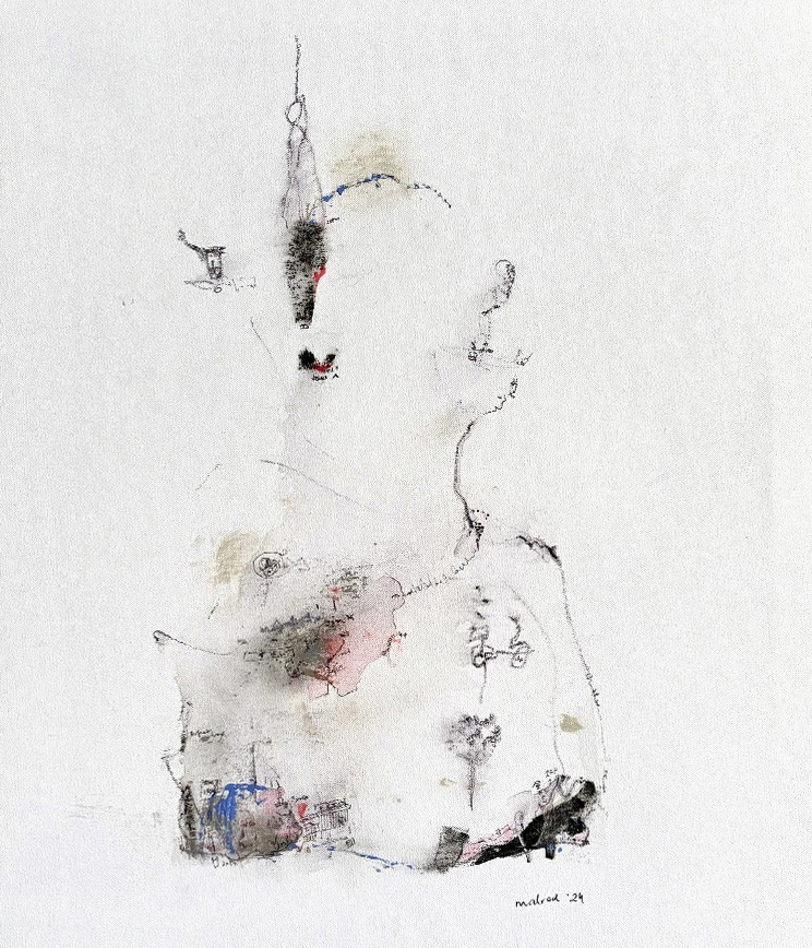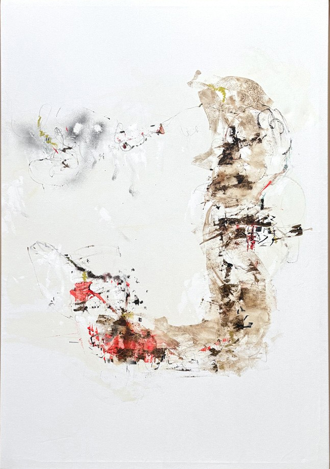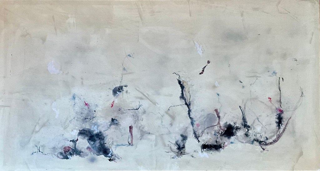 - El fondo blanco da vida a un proceso pictórico que remite a un interacción cromática de hilos y manchas como sentimientos prendidos de una acción del viento.